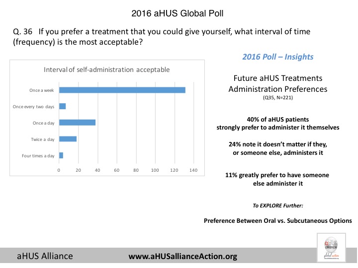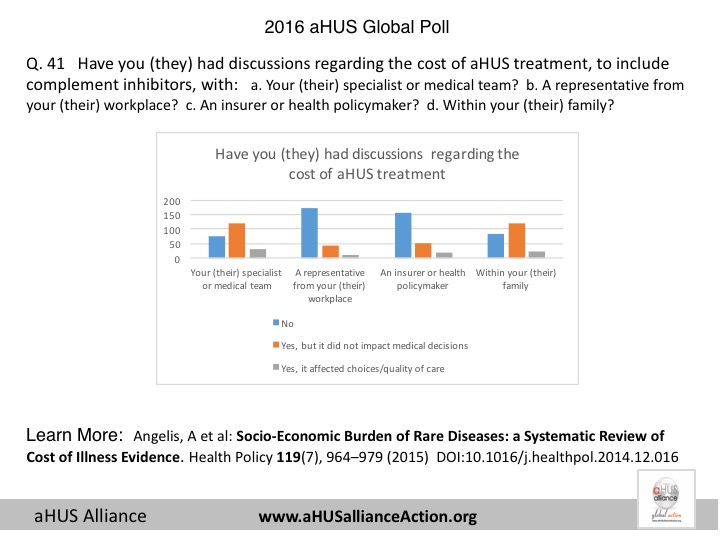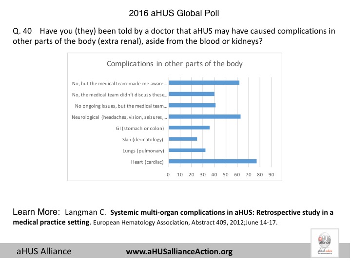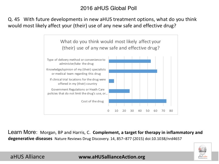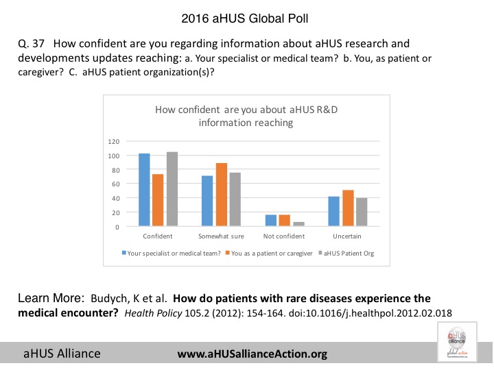 With 233 respondents from 23 nations, the 2016 aHUS Global Poll gathered data from adult aHUS patients and pediatric caregivers to provide information about their experiences with atypical HUS. This effort was launched on world Rare Disease Day in 2016 and was open from 28 February through 15 April and which allowed patients to access poll questions in 6 different languages: English, Spanish, French, Italian, Russian, and Japanese. The 2016 global poll questions were suggested from various sources, to include topics from the London 2015 aHUS Alliance multi-national meeting of patient organizations, online discussions across aHUS social media outlets, and interactions with atypical HUS researchers – all in conjunction with input from various interfaces within the aHUS arena. Additionally, some poll items were designed to help patient groups better understand the needs of their members and to explore the differences in care, diagnosis and treatment access around the world. All nations within the aHUS Alliance were invited to participate on the 2016 survey subcommittee and were encouraged to be involved with multiple aspects of the 2016 aHUS global poll, providing an international patient voice for this very rare disease.